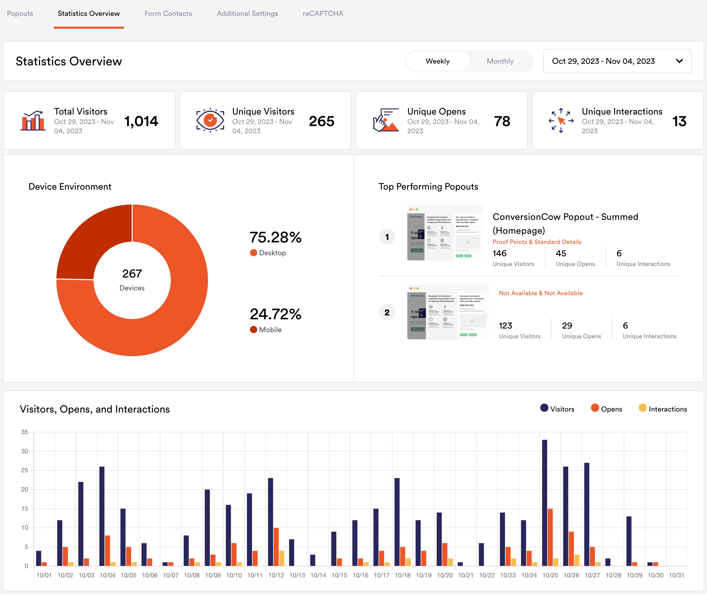 With ConversionCow, you gain access to a comprehensive Statistics Overview dashboard that provides a bird’s eye view of your website’s performance. Track metrics such as Total Unique Visitors, Unique Opens, and Unique Interactions across all your Popout campaigns. By analysing these metrics, you can gauge the effectiveness of your marketing efforts and tailor your strategies accordingly.